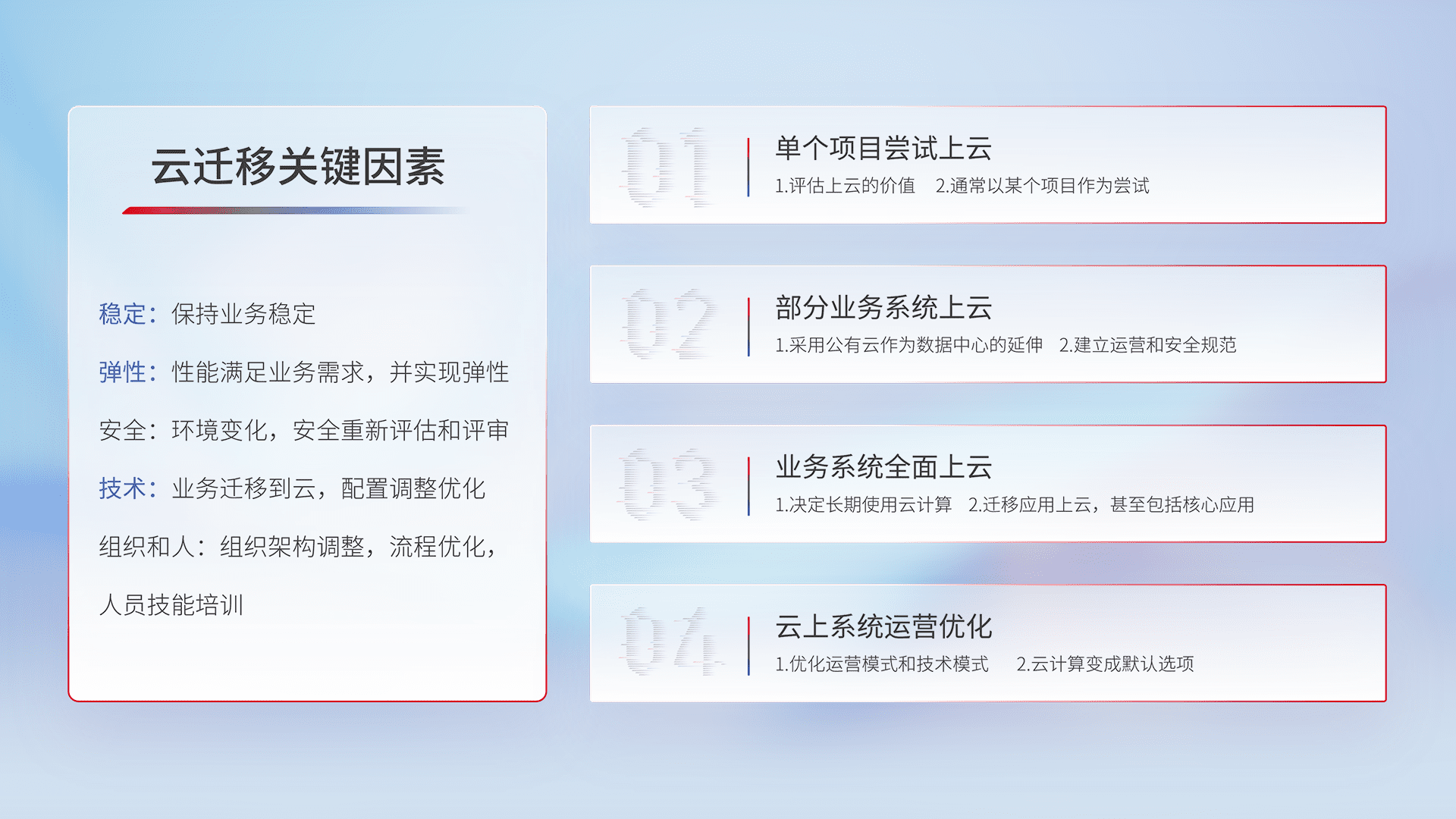 结合实际业务,,,,从规划设计、、云平台选型、、、、云原生改造、、、数据迁移、、、集成交付,,迁移全过程为客户识别最佳上云路径,,,,做好风险识别管理,,,设计网络架构、、身份权限、、、、安全审计合规、、、操作审计、、、、日志审计、、、监控告警策略、、、、多站点容灾设计等,,对云上基础设施进行整体规划,,提升IT治理水平,,以满足弹性、、、高可用、、、、高性能的需求。。。