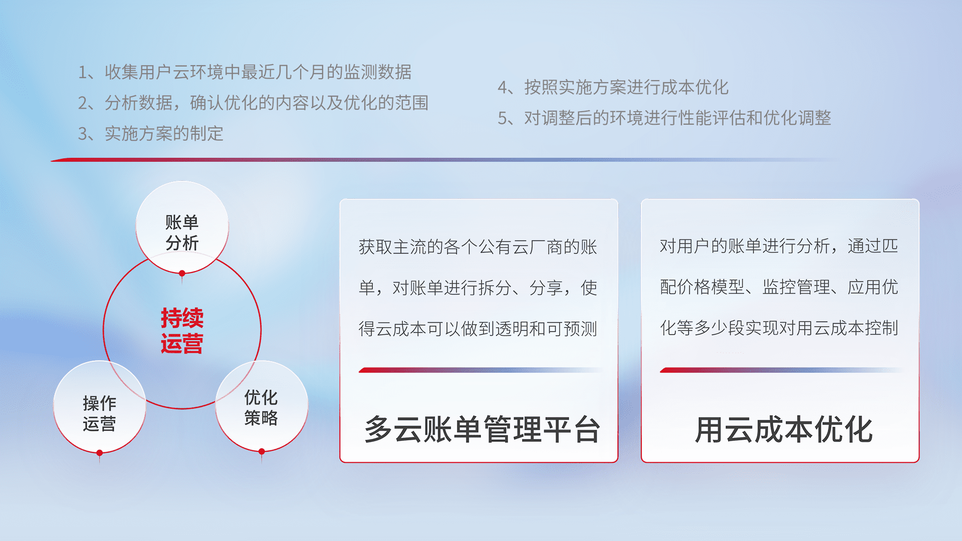 通过多云纳管,,,,以统一的资源数据模型把客户的云资源进行抽象和封装,,,进而实现对多云资源的统一操作,,,,保障云资源管理的可靠性、、、稳定性与可用性。。。量身定制化运维内容,,,,配置、、开发运维、、、补丁管理、、、备份、、监控、、认证和访问管理、、审计和日常巡检等,,,,保障在用云过程中的可靠度,,,稳定度以及高可用率。。。。